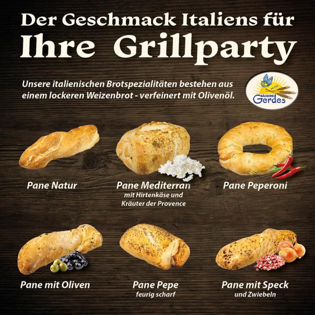 Wer etwas mehr Abwechslung beim Grillen möchte, sollte unsere verschiedenen Pane probieren. Unsere italienische Brotspezialität besteht aus einem lockeren Weizenteig und Olivenöl. Egal ob herzhaft, feurig scharf oder mediterran, wir haben für jeden Geschmack etwas dabei!
