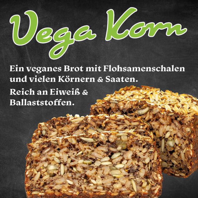 Unser neues Vega Korn ist ein ganz besonderes Brot. Da es ohne Mehl gebacken wird, werden Flohsamenschalen verwendet um das Brot in seiner Form zu halten. Da außerdem auf Hefe verzichtet wird, ist es zu 100% vegan.