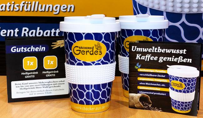 Gleichzeitig finden Sie in jedem gekauften Becher auch einen Gutschein für zwei Kaffeegetränke nach Wahl für Ihren Mehrwegbecher.